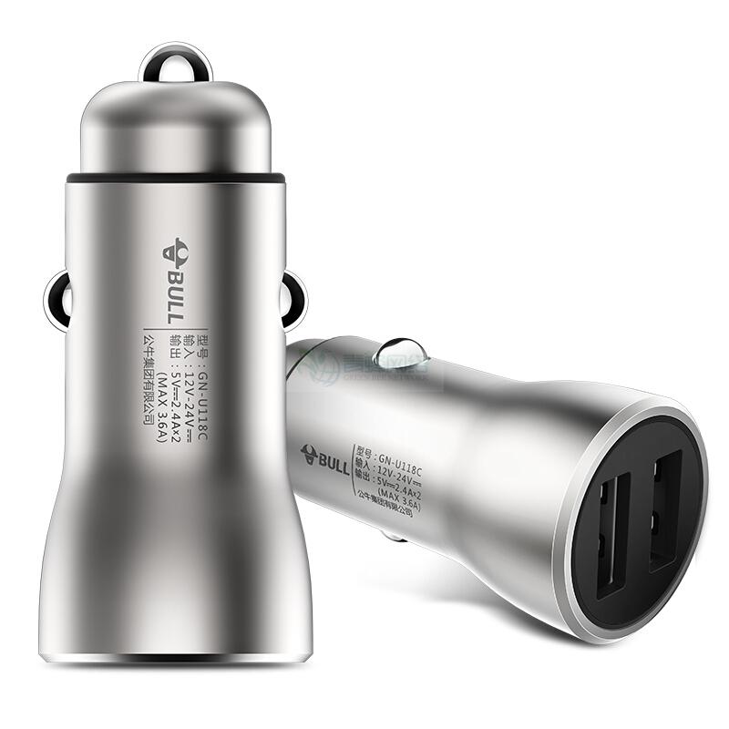 二手公牛(BULL)车载充电器 车充点烟器 GN-U118C银色5V/3.6A双USB一拖二 金属材质